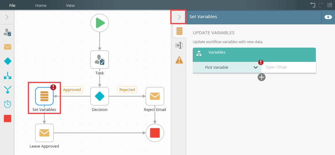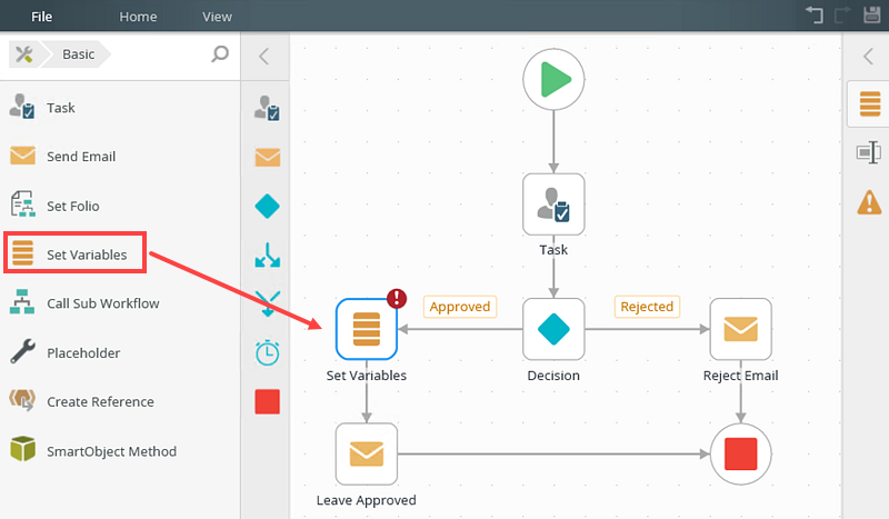 - From the Toolbox click the Basic category, and then drag the Set Variables step onto the canvas.