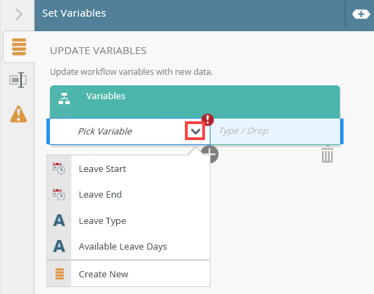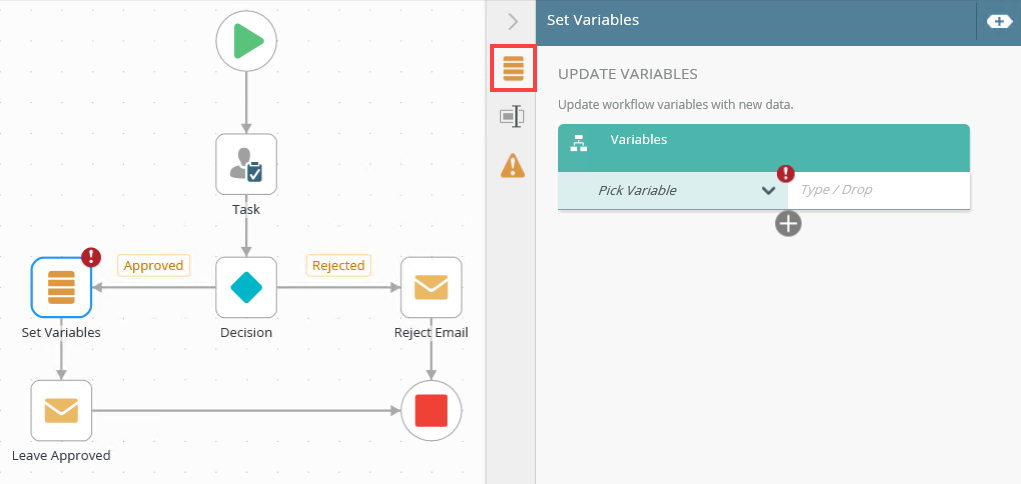Use the Set Variables step to update process variables. You have the option of setting static values manually or setting dynamic values by using inline functions, SmartObject data, and context from the workflow.