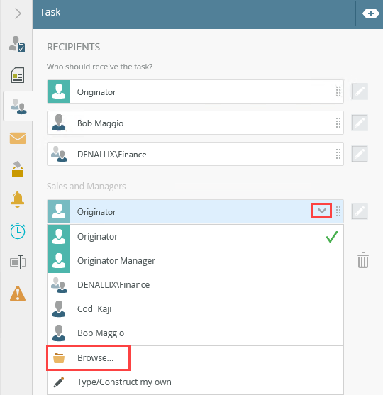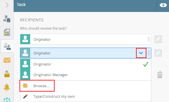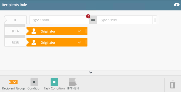 Select one of the default recipient options, either Originator and Originator Manager. By default, when adding a new recipient, the Originator is selected but this may not be correct for your logic. |