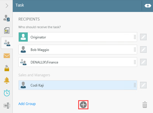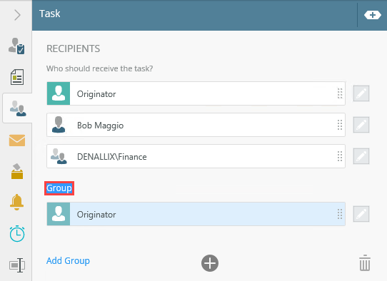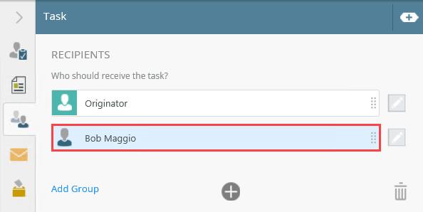 - Recipients - Use this section to specify which user or group receives the task. Add single recipient, create groups containing recipients, and create dynamic recipients.
