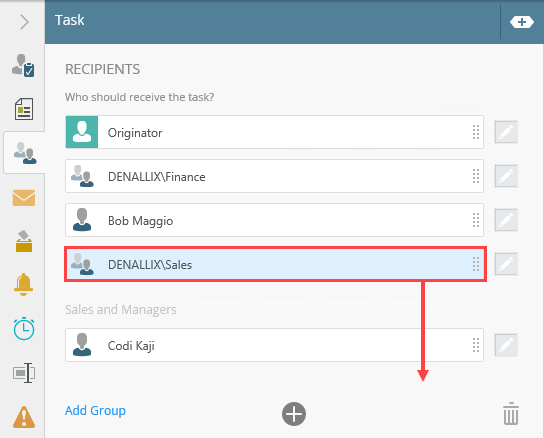 - From the recipients menu select who is to receive this task. In this example, any sales tasks above 5000 are sent to the Sales Group.