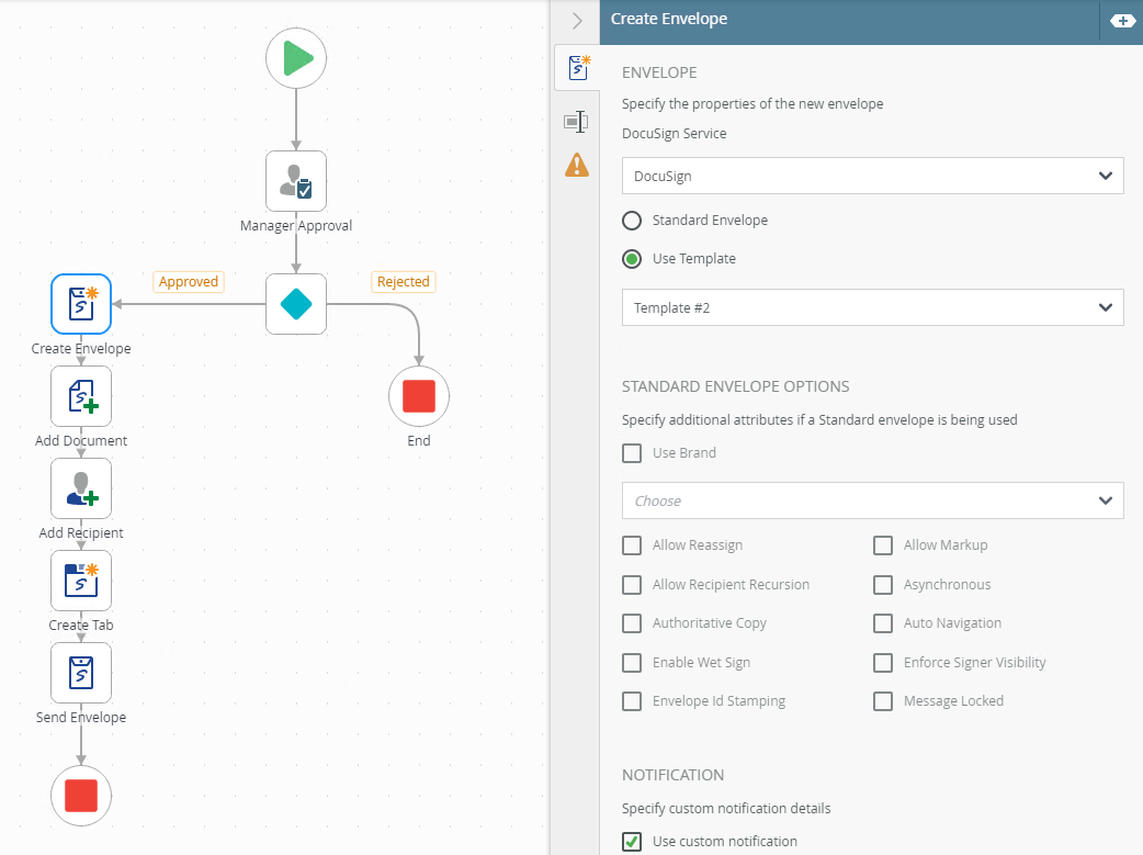 - Select the Create Envelope tab. Use this tab to select the DocuSign service instance, envelope template, envelope options, and the notification and return property mappings.