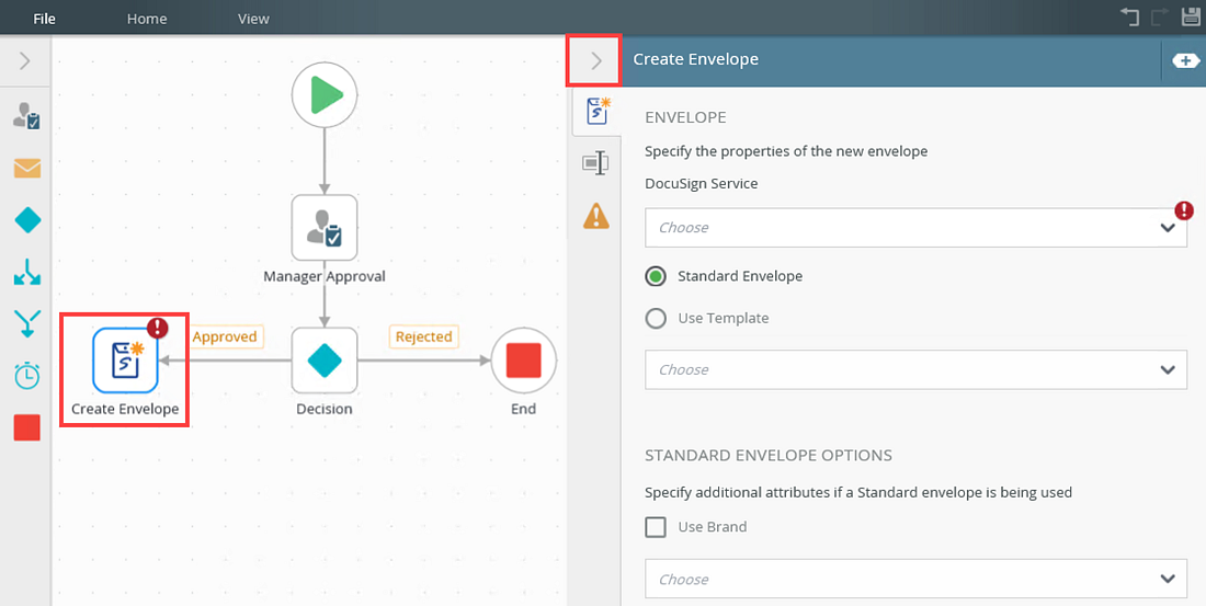 - From the Toolbox click the DocuSign category, the Envelope category and then drag the Create Envelope step onto the canvas.
