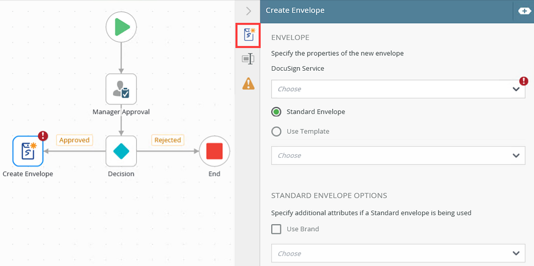 - From the DocuSign Service drop down menu, select the service instance. Select Standard Envelope or Use Template.