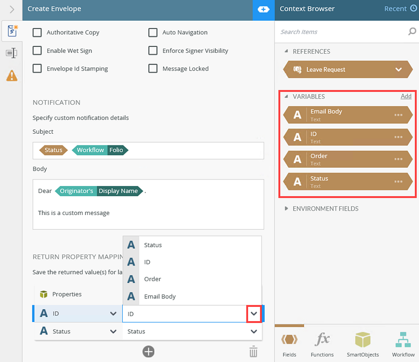 Body | Use this field when you use the Standard Envelope option or when you choose to customize the notification. Type the email body or drag fields from the Context Browser. | Type values or create dynamic values by dragging Functions, Fields, SmartObjects and Workflow-related items from the Context Browser into the fields. |