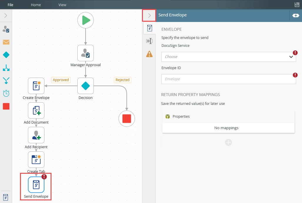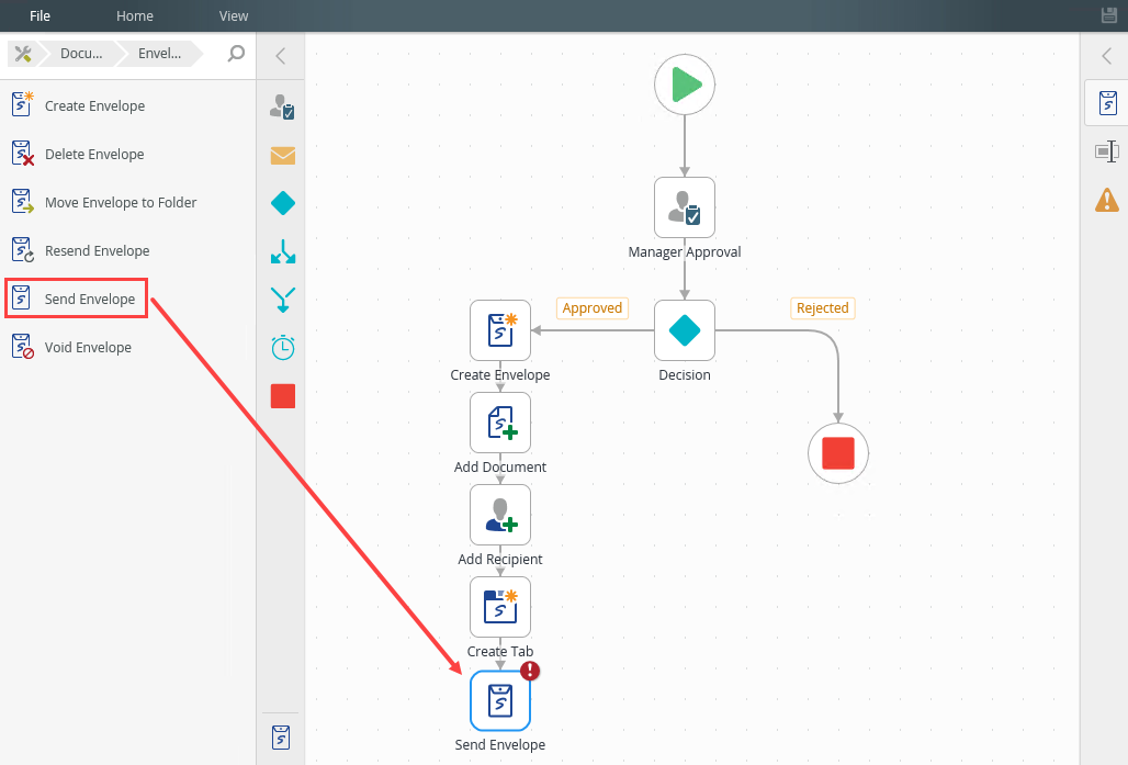 - From the Toolbox click the DocuSign category, the Envelope category and then drag the Send Envelope step onto the canvas.
