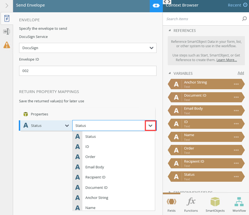 - From the DocuSign Service drop down menu, select the service instance. Add the Envelope ID and type a value or use inline functions or dynamic fields by clicking the expand or collapse toggle to expand the Context Browser. Within the Context Browser, select inline functions from the Functions, Fields, SmartObjects or the Workflow categories to define your function. Click and drag the function on to the field.