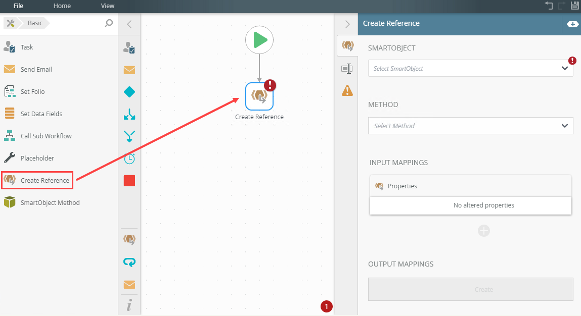 - From the Toolbox, click the Basic category, and then click and drag the Create Reference step onto the canvas. Configure this step to create a reference to a SmartObject list.