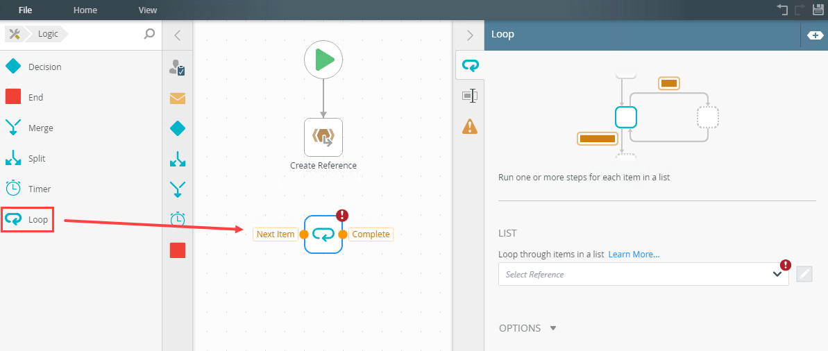 Item Reference | After selecting the reference from the List drop down menu, the current item in the loop is accessed by the created reference. The item reference shows below the selected list as a link. This link expands the Options section. | Click the added item reference link to expand the Options section. |