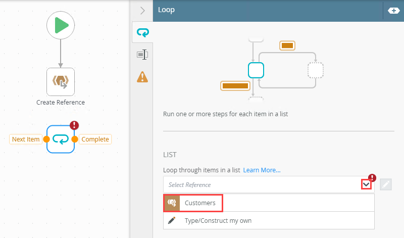 Specify a list to loop through. You can select a reference created within the workflow using a Create Reference step. |