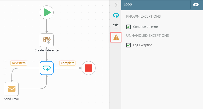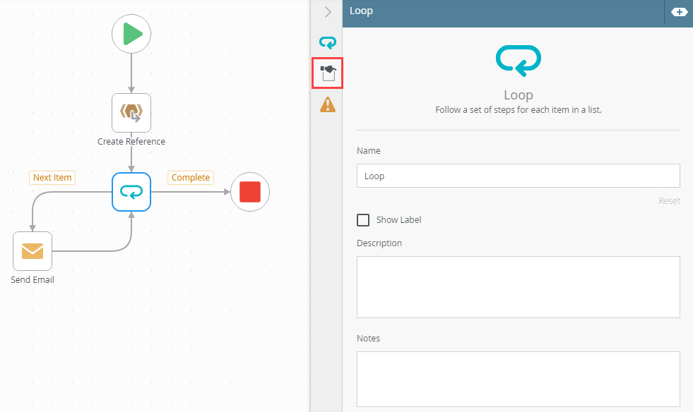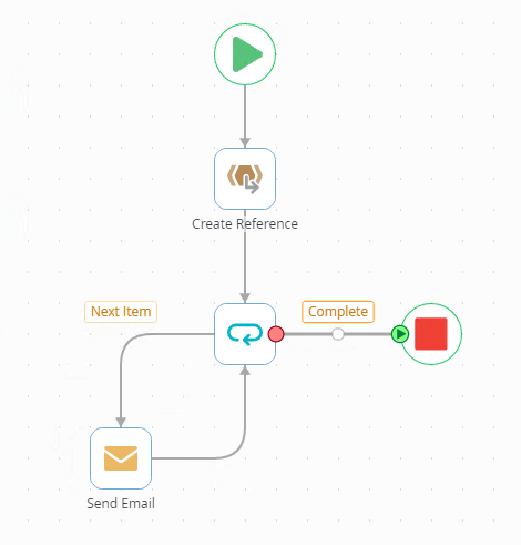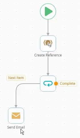 After the reference is created, the Next Item path (Send Email) is followed and loops back to the step. Before the next round of the Loop step starts, the non-outcome path is followed. This means if your Loop step loops through 10 items, the non-outcome path is also followed 10 times. After all items have been looped through, the complete and the non-outcome paths are followed, which means the non-outcome path is followed a total of 11 times.