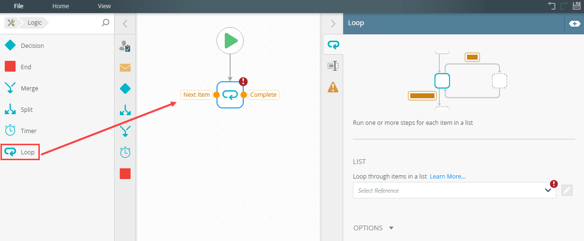 - From the Toolbox, click the Logic category, and then click and drag the Loop step onto the canvas.