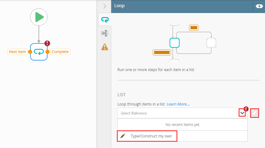 - The Loop step requires a List method type reference. This is created in the workflow (using the Create Reference step or any other step where a reference can be created using the List method) and selected from within the Loop step