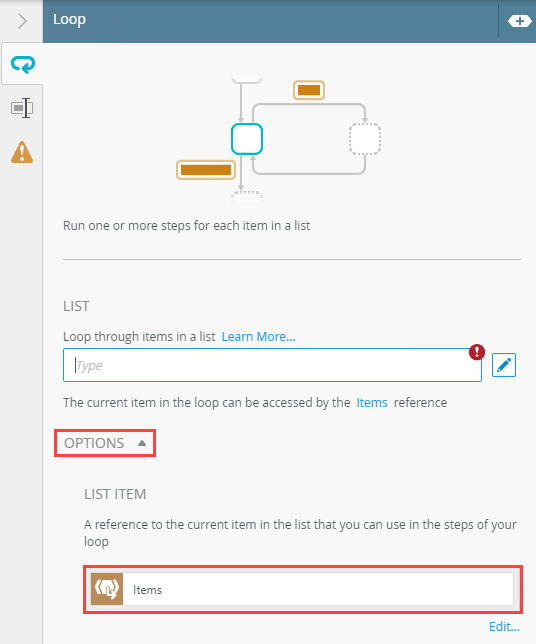 List Item | This is a reference to a current item in the list and automatically gets created when the list is selected. You can use this in your Loop steps. | Click the Edit link to change the List Item label. |