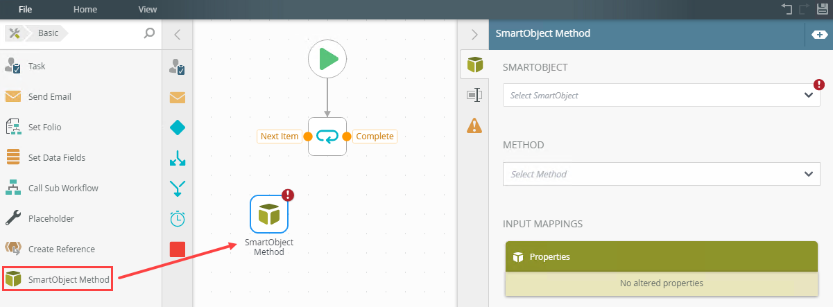 - From the Toolbox click the Basic category, and then click and drag the SmartObject Method step onto the canvas.