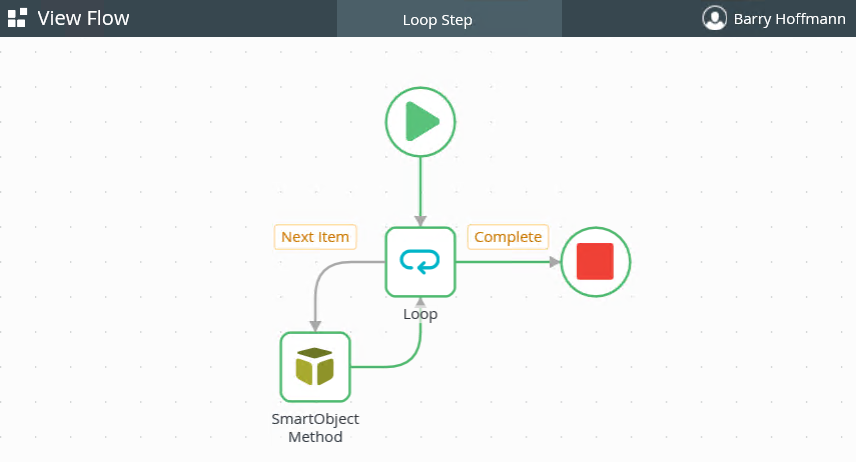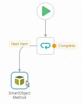 - Drag a line from the Next Item port (on the Loop step) to connect it to the SmartObject Method step.