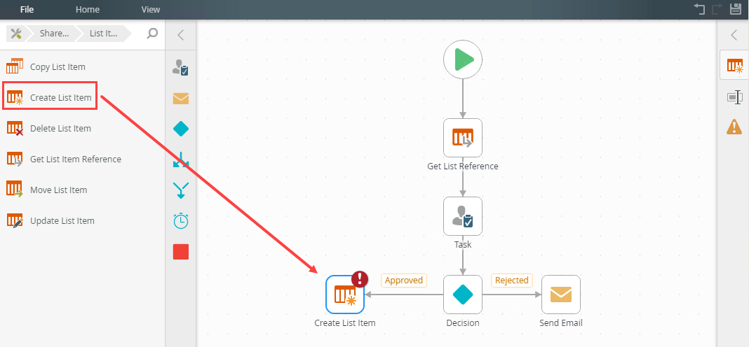 - From the Toolbox click the SharePoint category, the List Items category and then drag the Create List Item step onto the canvas.
