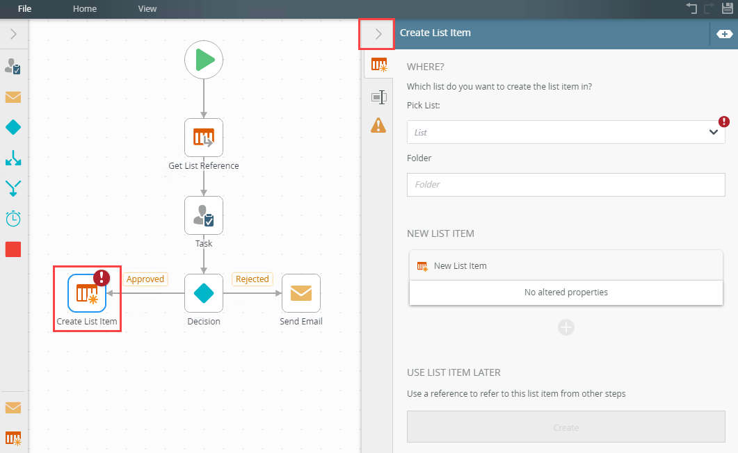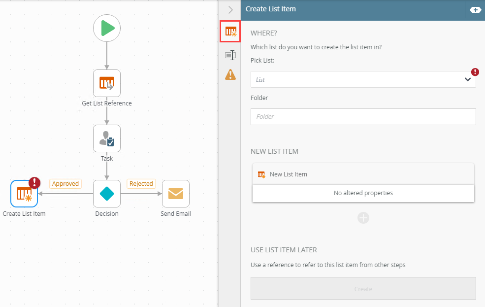 - Select the Create List Item tab. Use this tab to configure the list item properties.