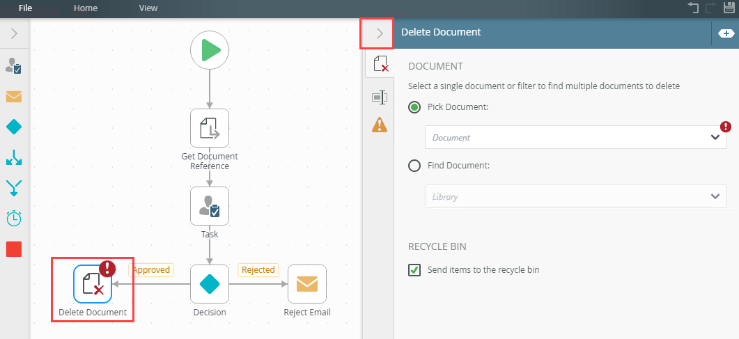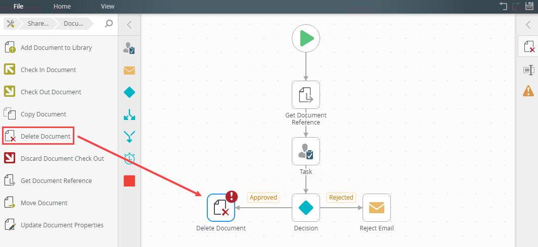 - From the Toolbox click the SharePoint category, the Document category, and then drag the Delete Document step onto the canvas.