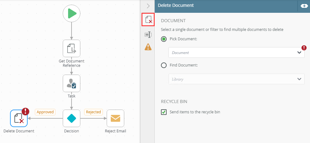 - Select the Delete Document tab. Use this tab to configure which document to delete.
