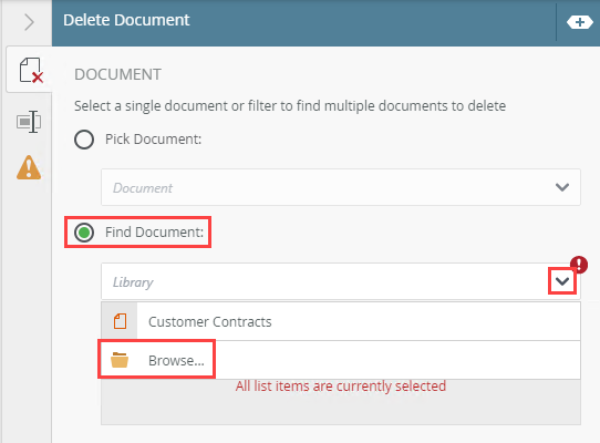 In this example, select Find Document. From the drop down menu select Browse and navigate to a location of the document to delete.