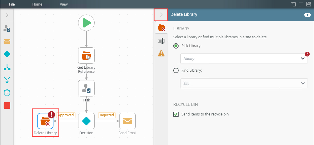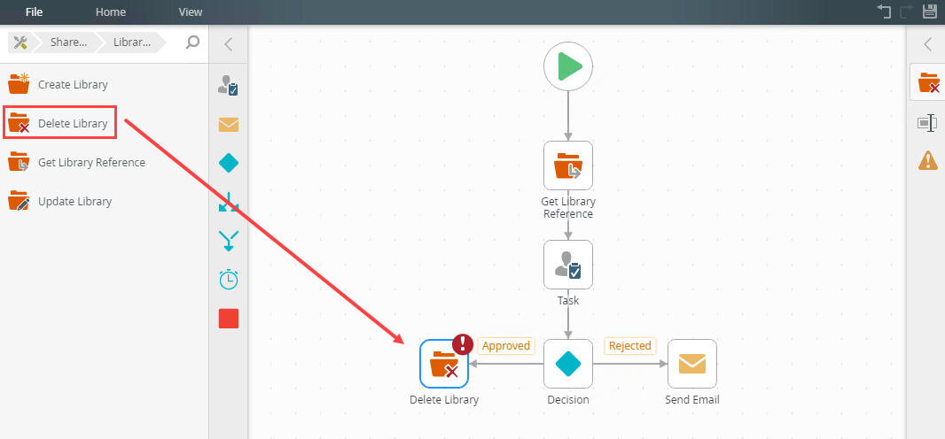 - From the Toolbox click the SharePoint category, the Libraries category and then drag the Delete Library step onto the canvas.