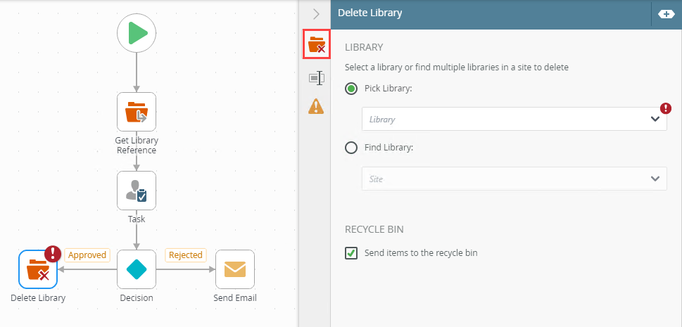 Use the Delete Library step to delete a library from a SharePoint site. You can, for example, use the Delete Library step to delete a temporary SharePoint library created for a project that has ended.