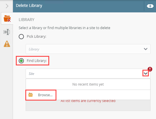 Find Library | Specify the site and filters to define a library for the reference, and provide a name for the reference. If no reference is available to select from the Pick Library drop down menu, browse to the Site on a registered SharePoint Site Collection. | Click the Find Library radio button to enable this option. Click the drop down menu and select Browse to browse to a specific site. |