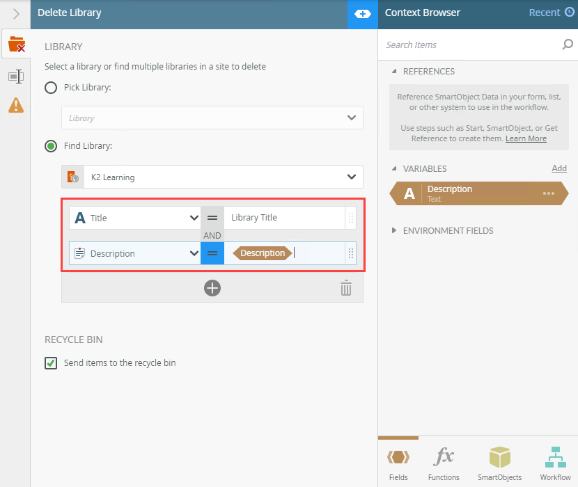 - Select a property from the drop down menu. Select an operator to define the filter. Type values or create dynamic values by dragging Functions, Fields, SmartObjects and Workflow-related items from the Context Browser into the fields.