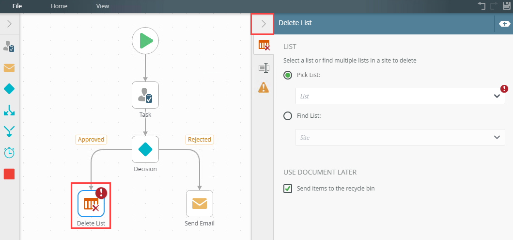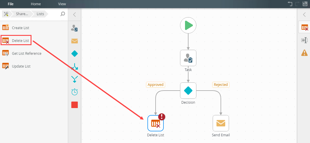 - From the Toolbox click the SharePoint category, the Lists category and then drag the Delete List step onto the canvas.
