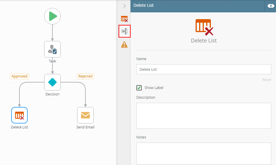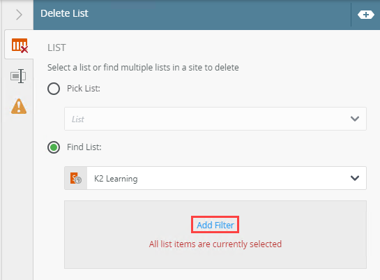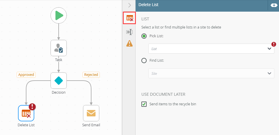 Use the Delete List step to delete a list from a SharePoint site. You can, for example, use the Delete List step in a workflow that removes a list containing orders (each order being a list item) when they are no longer needed for auditing purposes.