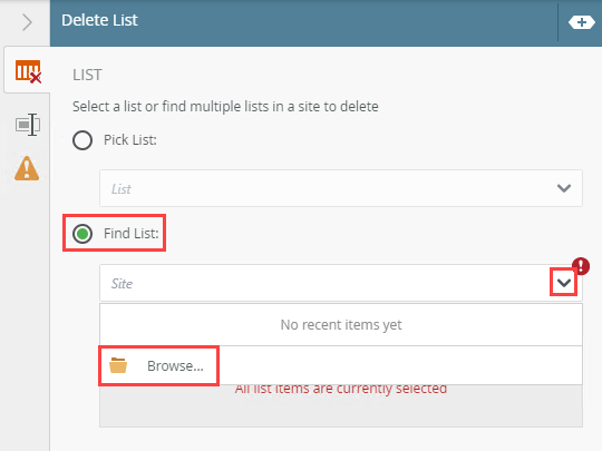 Find List | Specify the site and filters to define a list for the reference and provide a name for the reference. If no reference is available to select from the Pick List drop down menu, browse to the Site on a registered SharePoint Site Collection. | Click the Find List radio button to enable this option. Click the drop down menu and select Browse to browse to a specific site. |