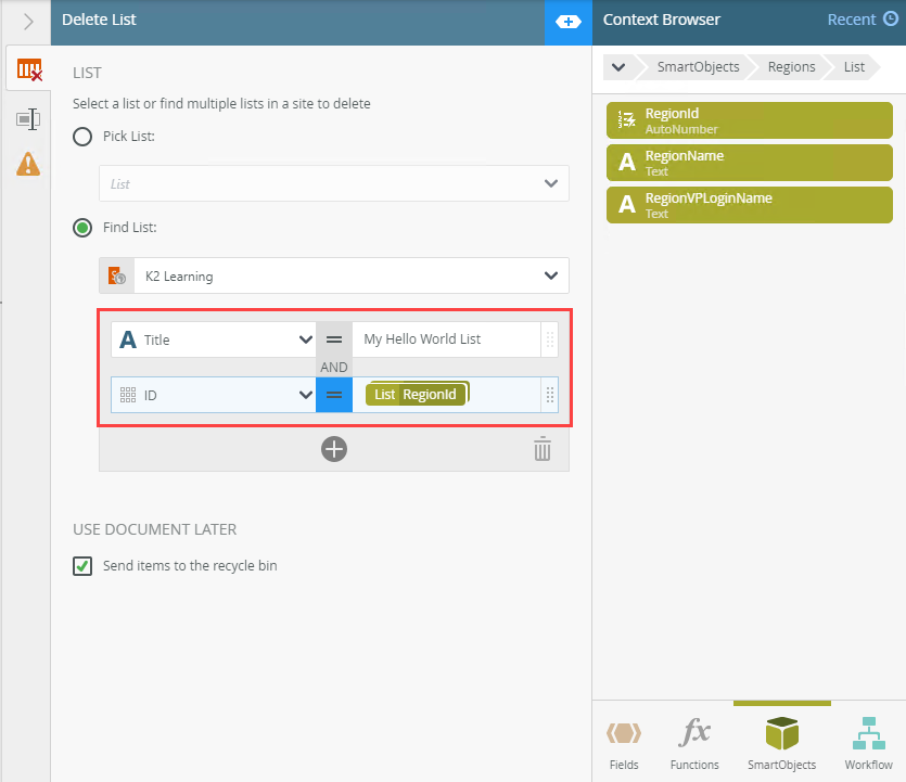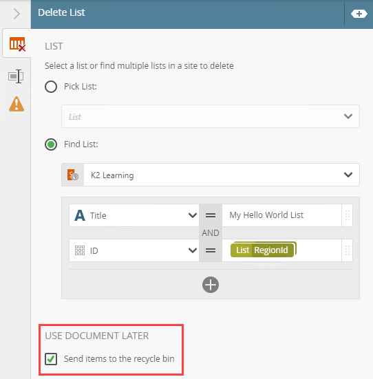- From the Use Document Later section select whether to send the deleted list to the recycle bin (checked by default).