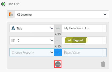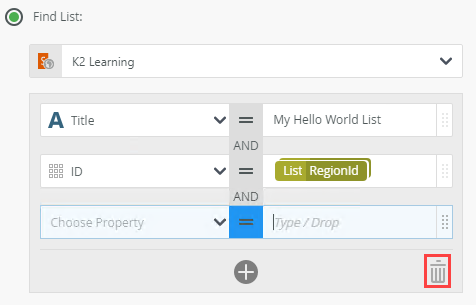 - Select a property from the drop down menu. Select an operator to define the filter. Type values or create dynamic values by dragging Functions, Fields, SmartObjects and Workflow-related items from the Context Browser into the fields.