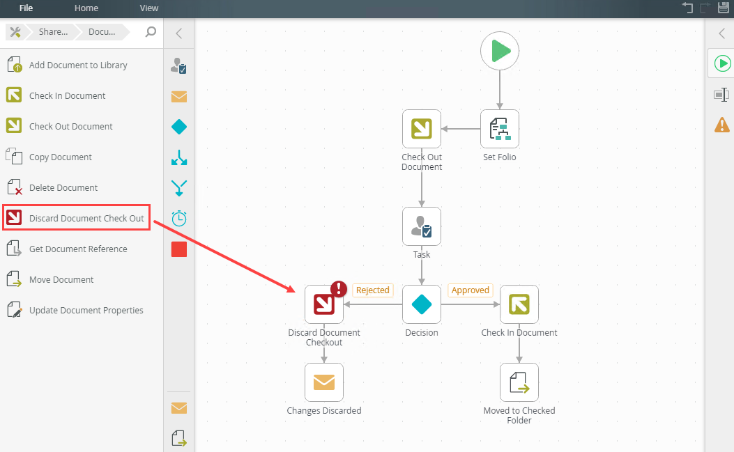 Drag the Discard Document Checkout step from the SharePoint category, Favorites bar, or the Recent category onto the canvas.