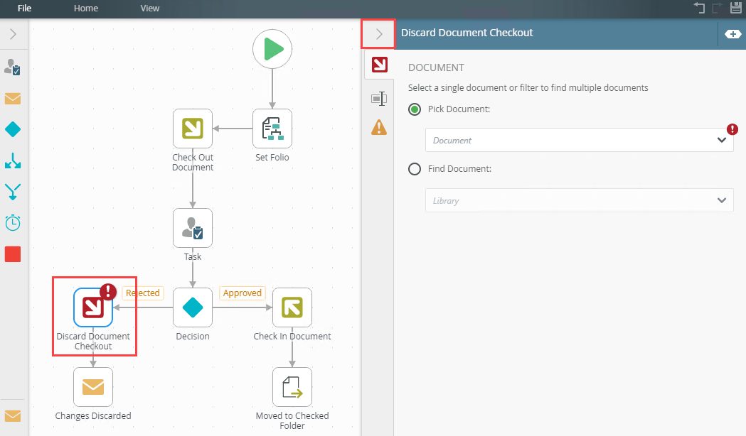 - From the Toolbox click the SharePoint category, the Document category, and then drag the Discard Document Checkout step onto the canvas.