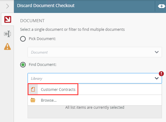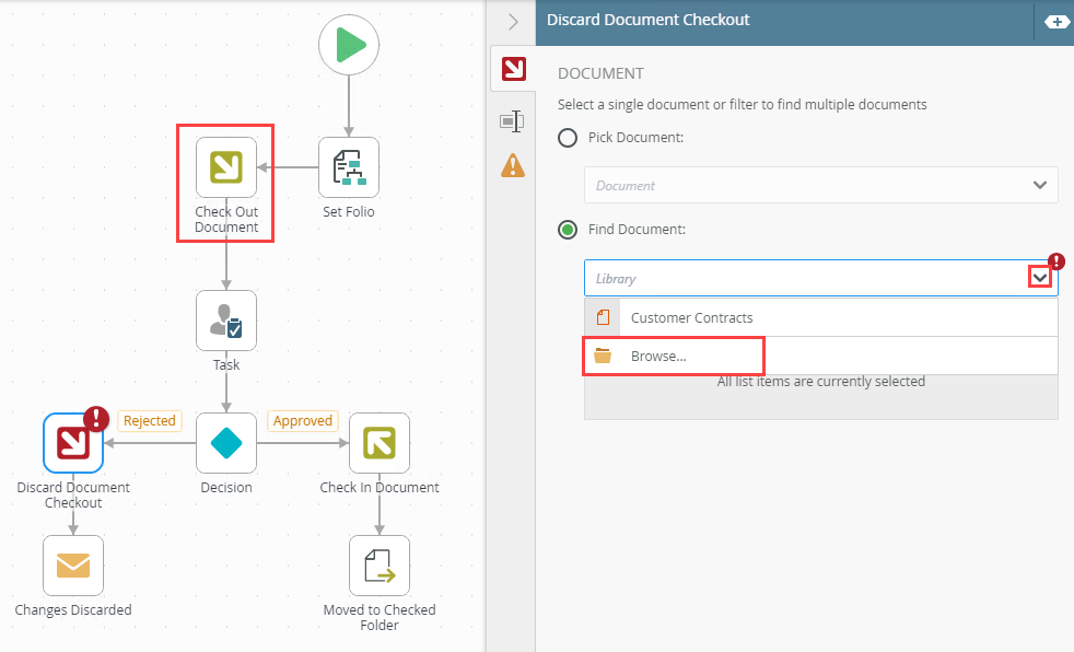 In this example, select Find Document. From the drop down menu select Browse and navigate to a location of the document to discard the check out on. Notice that the library selected in the Check Out Document step shows in the drop down menu.