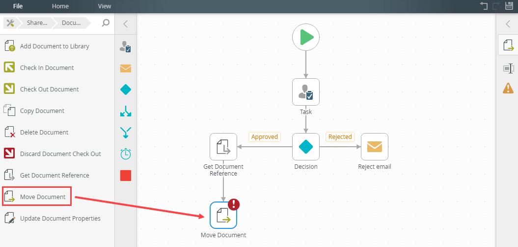 - From the Toolbox click the SharePoint category, the Document category, and then drag the Move Document step onto the canvas.