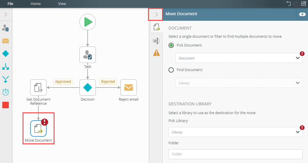 - Select the Move Document tab. Use this tab to configure the step's properties.