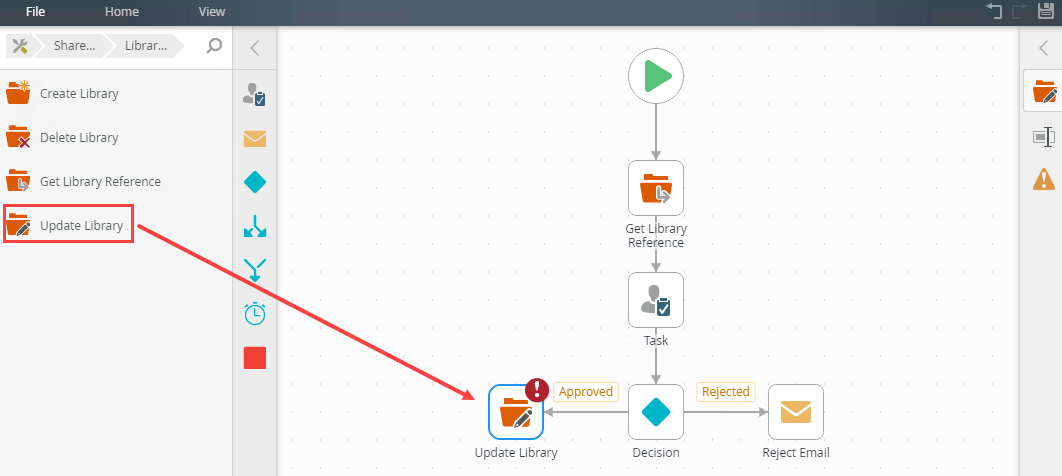 - From the Toolbox click the SharePoint category, the Libraries category and then drag the Update Library step onto the canvas.