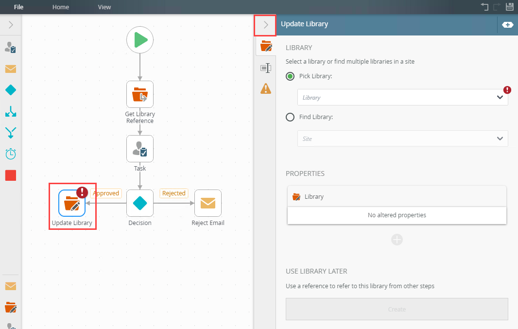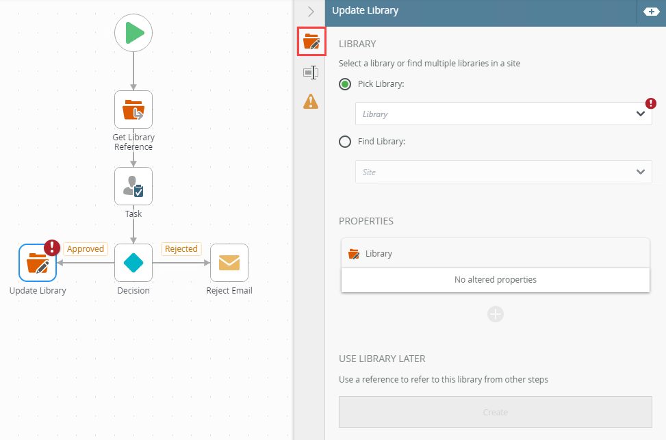 Use the Update Library step to update a SharePoint library. You can, for example, use the Update Library step in a workflow to change the title or description of a library based on a decision or event.