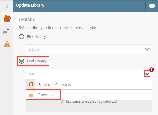 Find Library | Use this to browse to the library. | Click the Find Library radio button to enable this option. Click the drop down menu and select Browse to browse to a specific site. |
