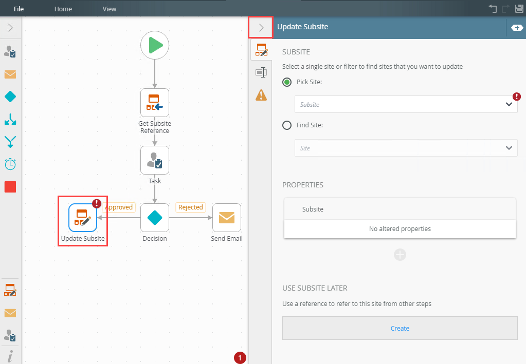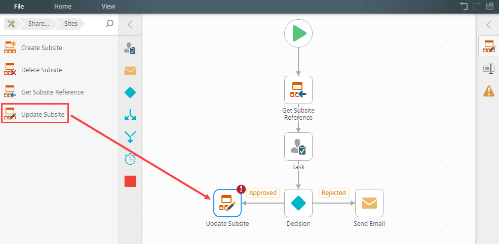 - From the Toolbox, click the SharePoint category and then Sites. Drag the Update Subsite step onto the canvas.