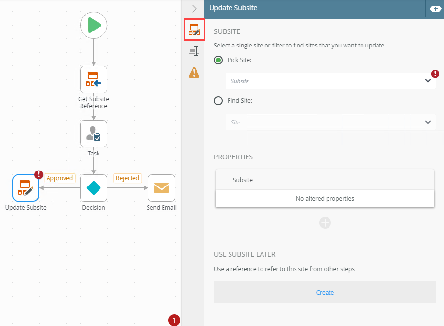 Use the Update Subsite step to update a SharePoint site. You can use the Update Subsite step, for instance, to update a site name or description based values entered on a form or retrieved from a SmartObject.