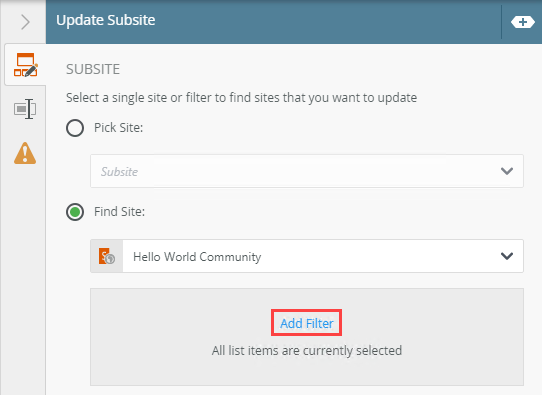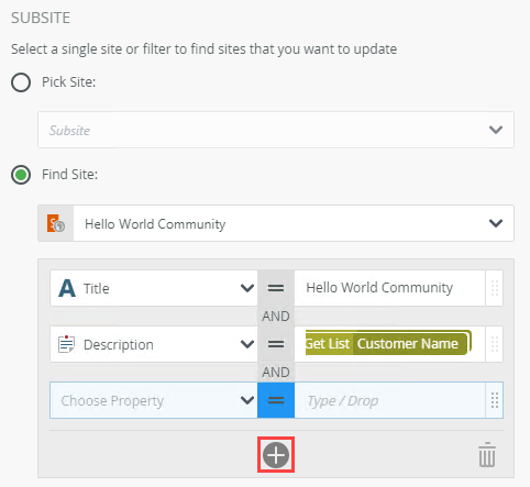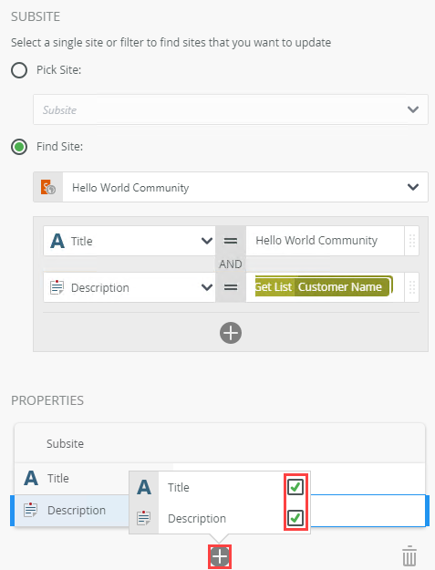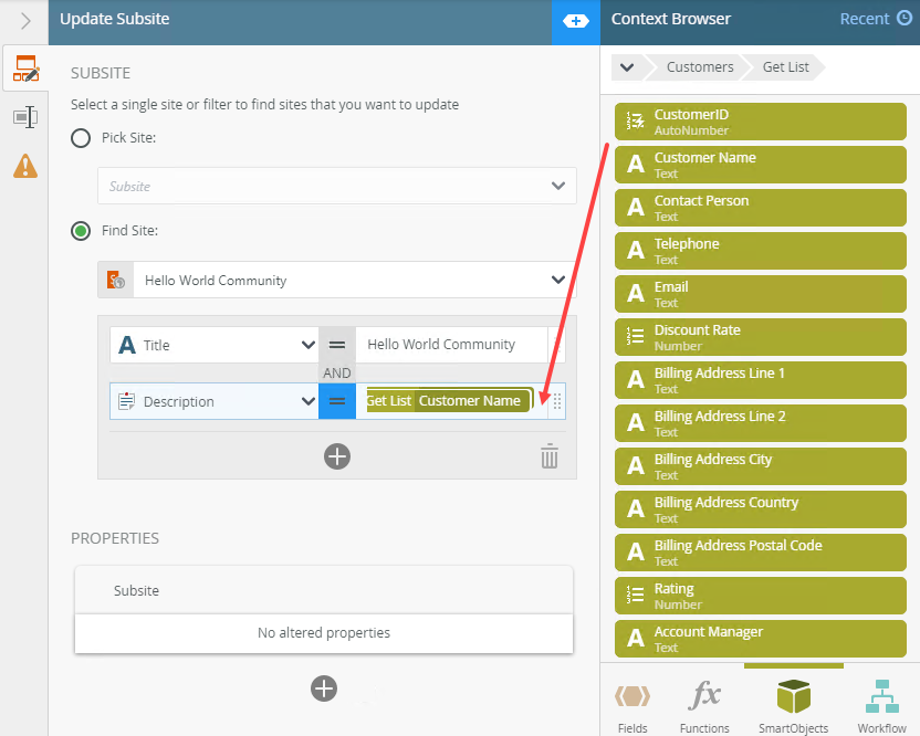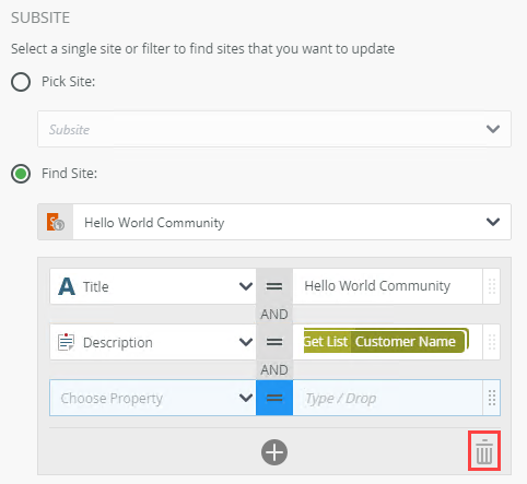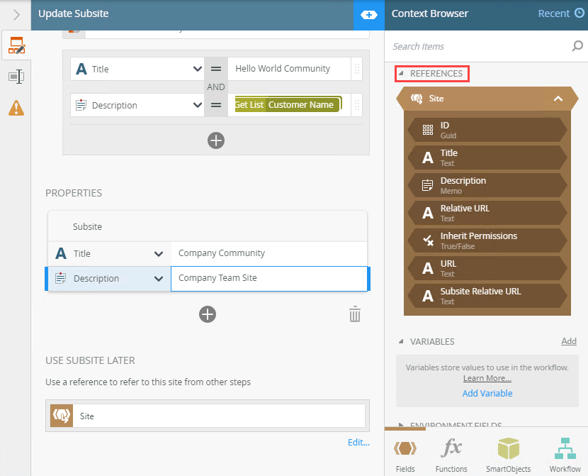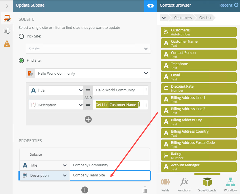 Properties | Use this to set the filters to select the site to be updated. Filter for specified values in one or more fields to identify the site. Type values or create dynamic values by dragging Functions, Fields, SmartObjects and Workflow-related items from the Context Browser into the fields. Note: When a SmartObject load method property is used, an input property is required for the correct information to load. | Click the Name field to add a name by typing or dragging a value. Click the Add button to add the Description field. To delete properties, select them and click the Trash bin. |