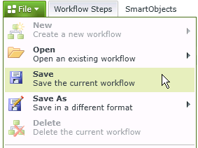 - With your workflow open on the workflow design canvas, select File > Save from the workflow ribbon. K2 saves the current workflow to the K2 server.