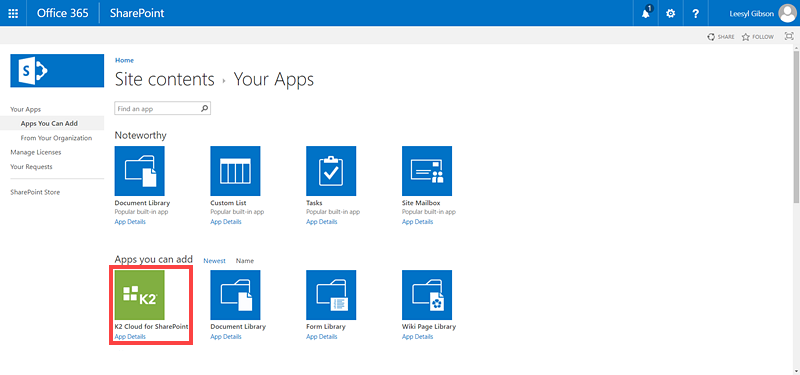 The K2 for SharePoint App Settings page can be accessed by clicking on the K2 Five App in the SharePoint Site Contents page.