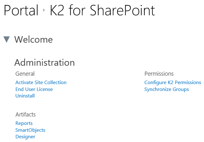 Use the options below to access and manage K2 for SharePoint features and settings.