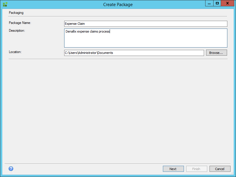 On the Create Package dialog, specify a name for the package in the Package Name text box. Enter a description of the package and click the Browse button to choose the location to save it.