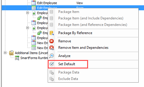- If you want a form to be opened immediately after the package is deployed, right click the form and select Set Default. Only one form can be configured as the default. (This option is often used if you need the deploying user to do additional configuration to allow the application to work, or if you want to show a form with additional information to the deploying user once the package is deployed).